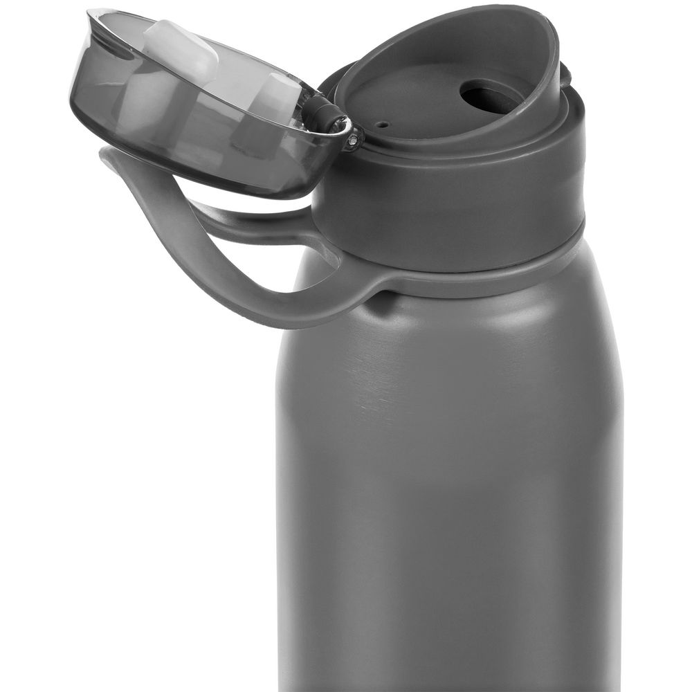 Легкая бутылка для спорта с откидной крышкой и силиконовой петлей для удобной транспортировки.