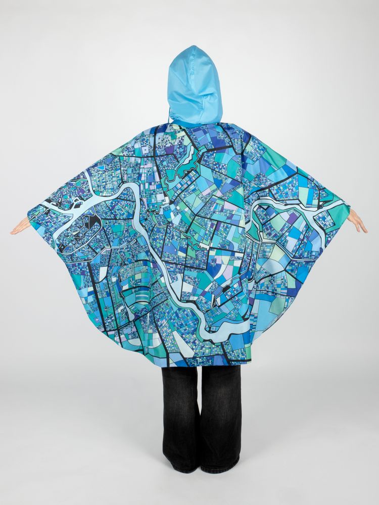 Легкий городской дождевик-пончо с регулируемым капюшоном из влагоустойчивого материала подходит для защиты в непогоду, свободно одевается поверх одежды и небольшого рюкзака.
