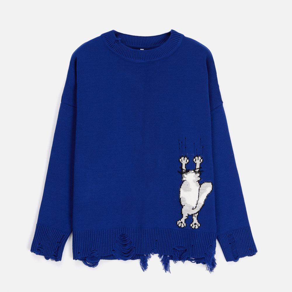 В дизайне мягкого джемпера с круглым вырезом Sharpick гранж-эстетика органично сочетается с милым акцентом — пушистым рисунком в виде озорного котика. Получается веселая вариация на тему того, откуда берется модная рваная одежда, а джемпер моментально создает настроение легкой несерьезности. Рваные края изделия добавляют современную нотку, а резинка на вороте, манжетах и по низу обеспечивает удобную посадку.