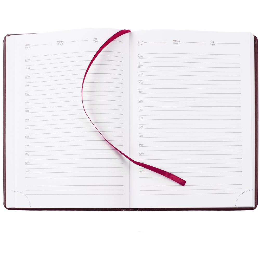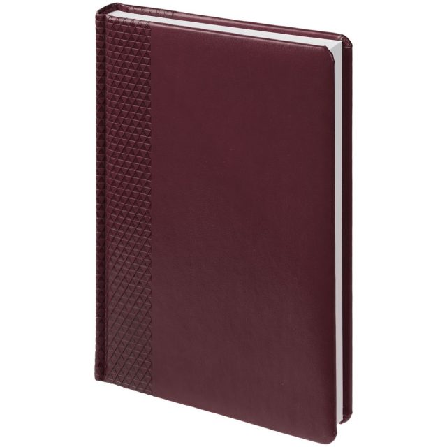 Ежедневник с твердой обложкой, выполнен из материала Waltz, бордовый QQ, дополнен ляссе в цвет материала.