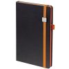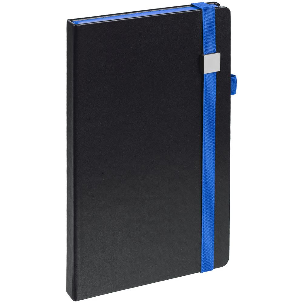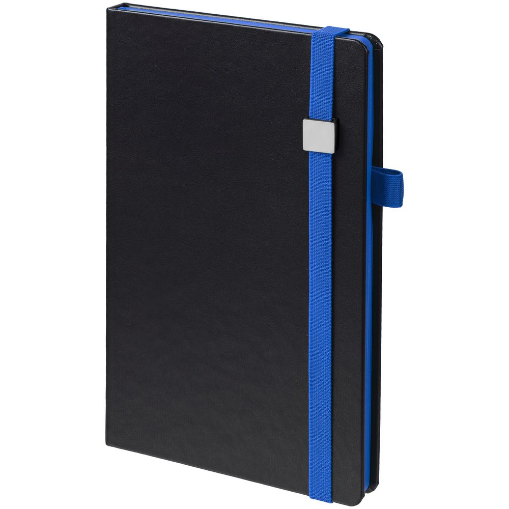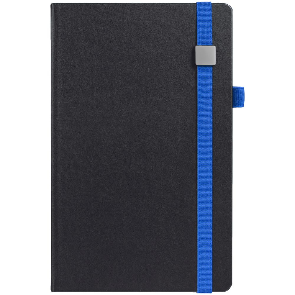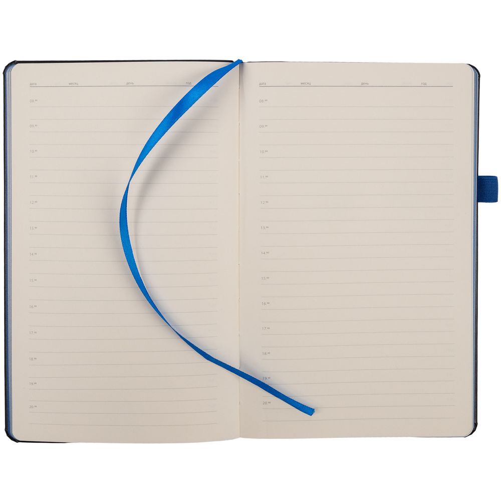Ежедневник с полутвердой обложкой, выполнен из материала Waltz, черный АА, дополнен синей резинкой с металлическим шильдом и ляссе.