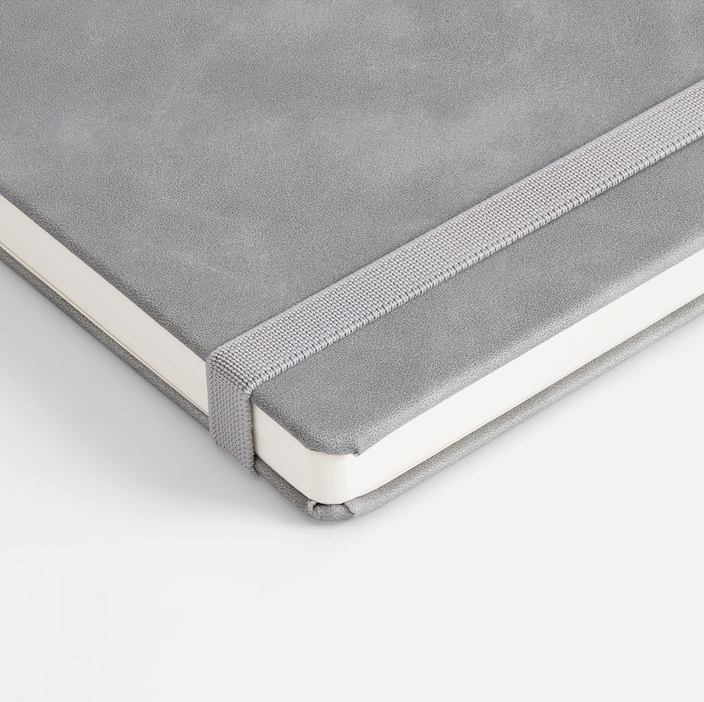 Ежедневник с твердой обложкой, выполнен из материала Nubuck Touch, серый СС, дополнен ляссе темно-серого цвета.