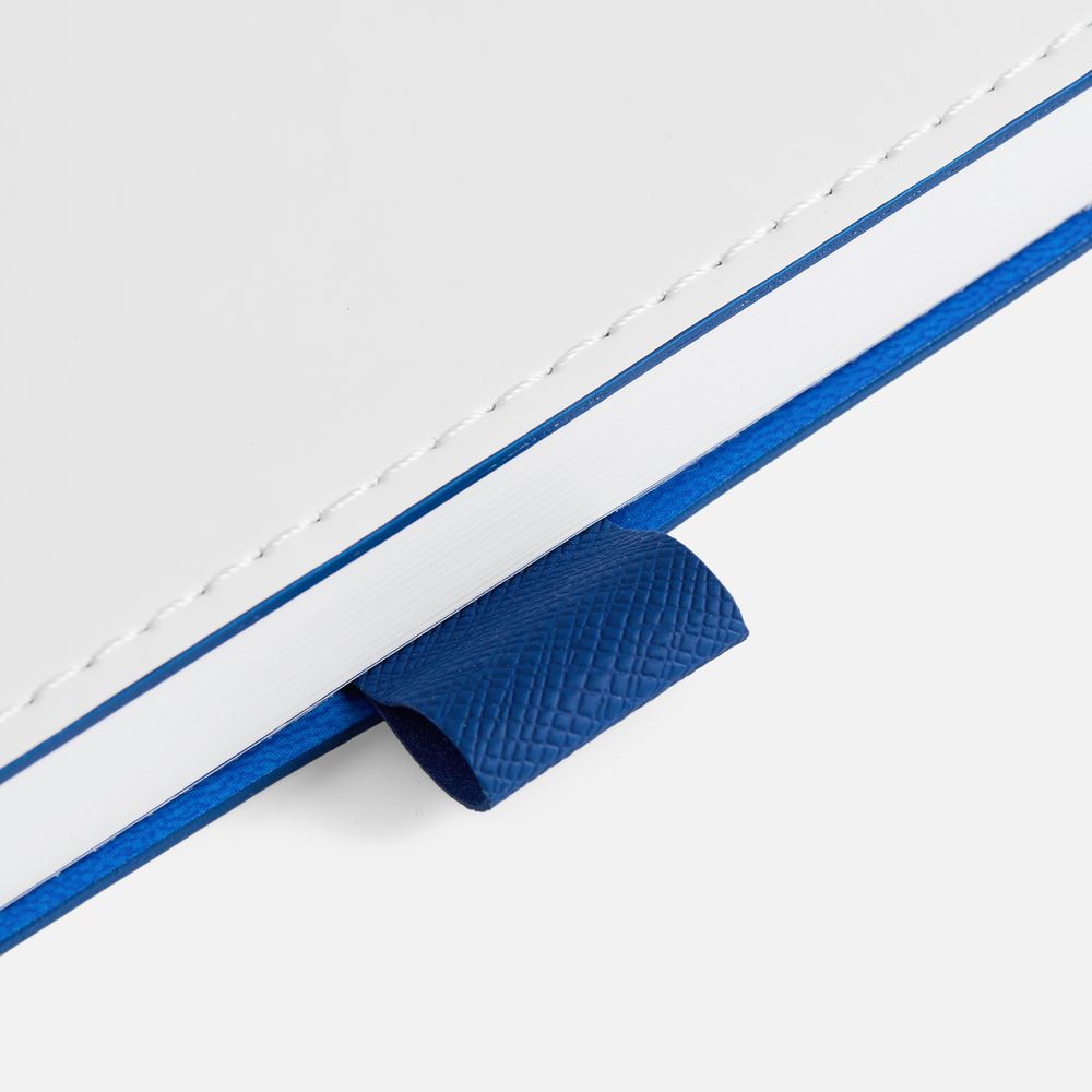 Гибкая обложка, материал обложки — Soft Touch, белый BB и Latte, синий НН; материал петли для ручки — Nice Touch, синий НН. Срез обложки окрашен в синий цвет.