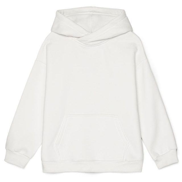 Детское худи унисекс со спущенным плечом и карманом-кенгуру.