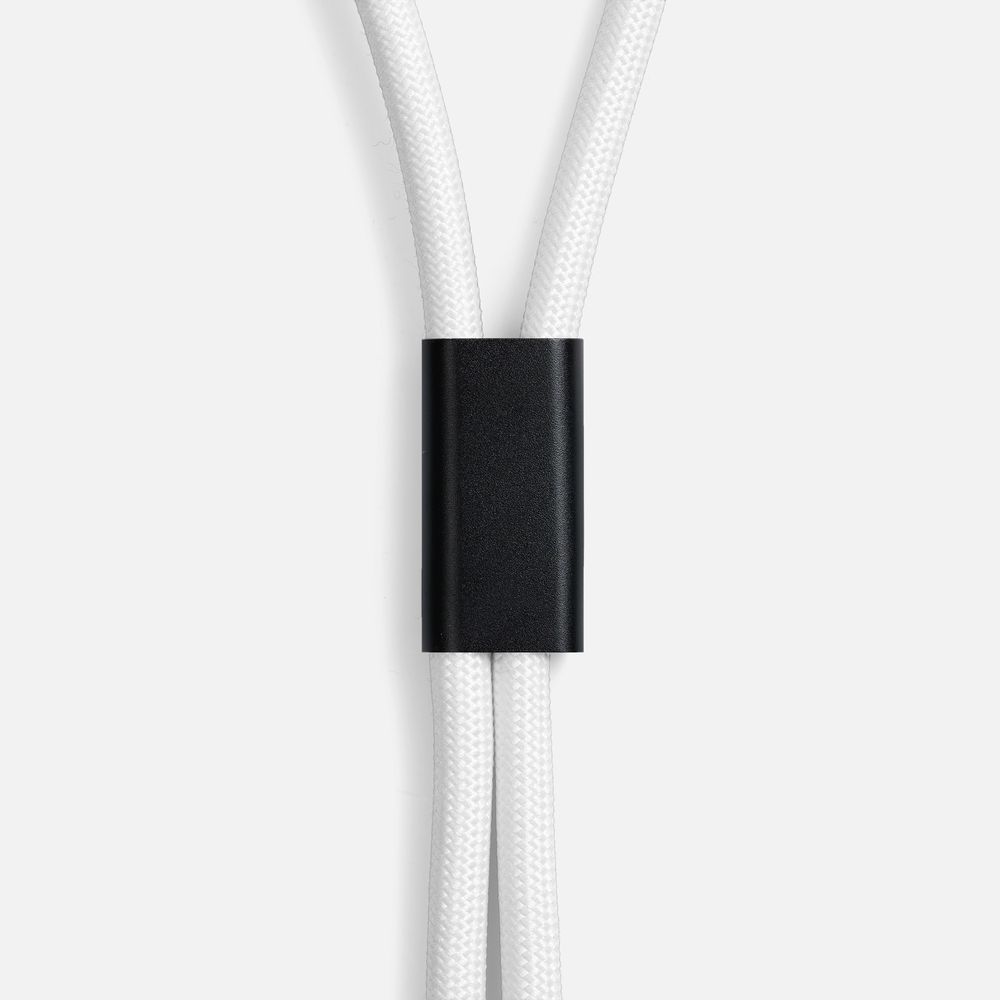 Важно: Для крепления кабеля телефон должен иметь чехол. Если ланьярд распускается под тяжестью смартфона, убедитесь, что среднее из трех колец фурнитуры находится по центру ланьярда (на шее под затылком), а не сбоку. Соседние ветви оплетки должны идти вместе, без зазоров, так достигается трение ткани о ткань.