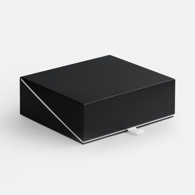Коробка изготовлена из переплетного картона. Внутренний короб каширован мелованной бумагой с ламинацией, внешний корпус — лайнером из металлизированной бумаги Magestic цвета «Антрацит», плотностью 120 г/м². Крышка фиксируется на магнит.