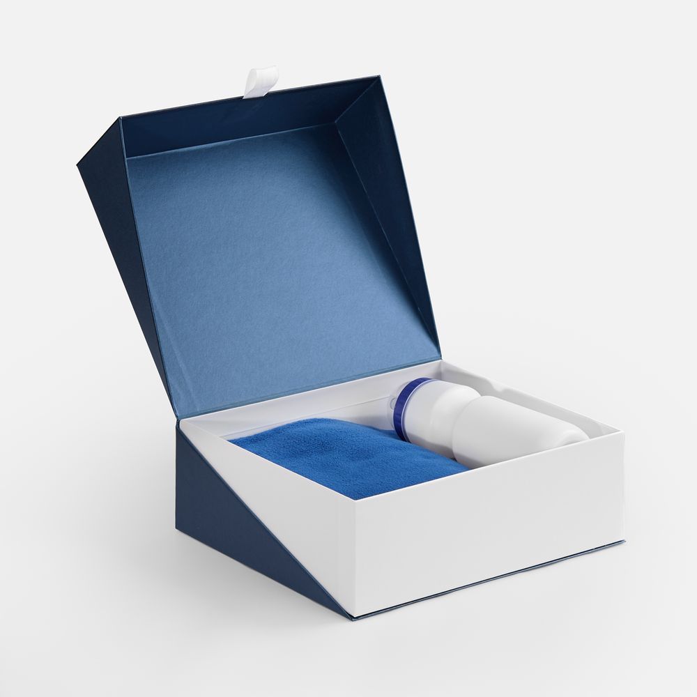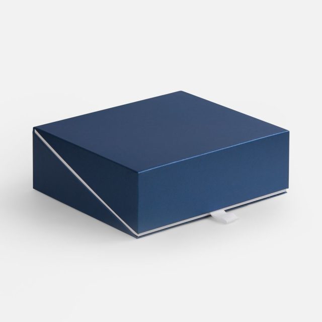 Коробка изготовлена из переплетного картона. Внутренний короб каширован мелованной бумагой с ламинацией, внешний корпус — лайнером из металлизированной бумаги Pearl Dream Blue, плотностью 135 г/м². Крышка фиксируется на магнит.
