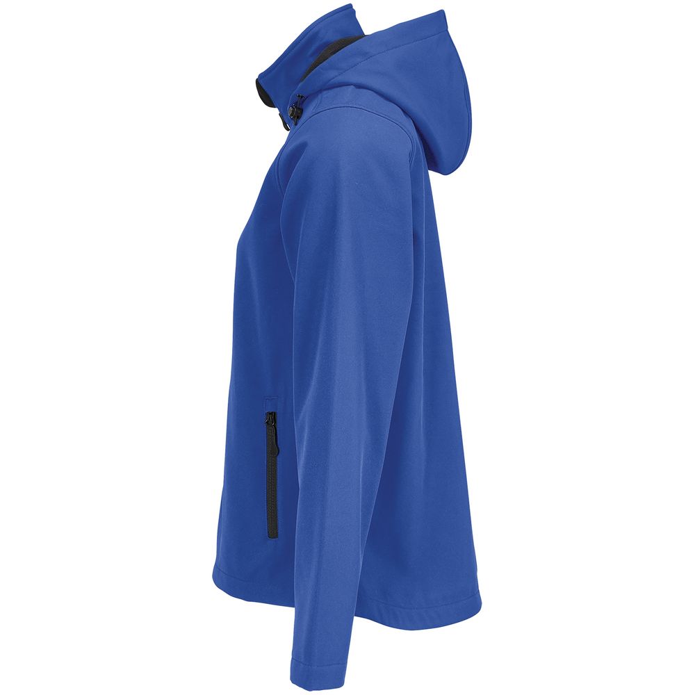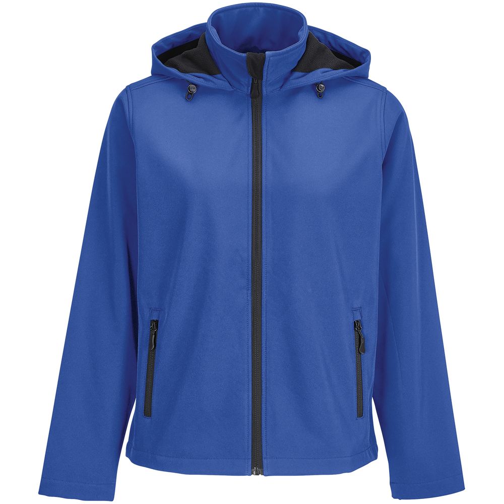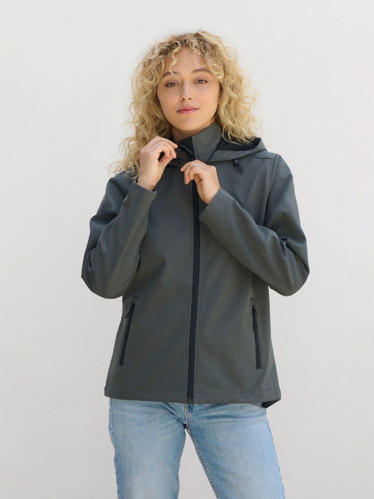 Женская куртка софтшелл на молнии и с капюшоном.