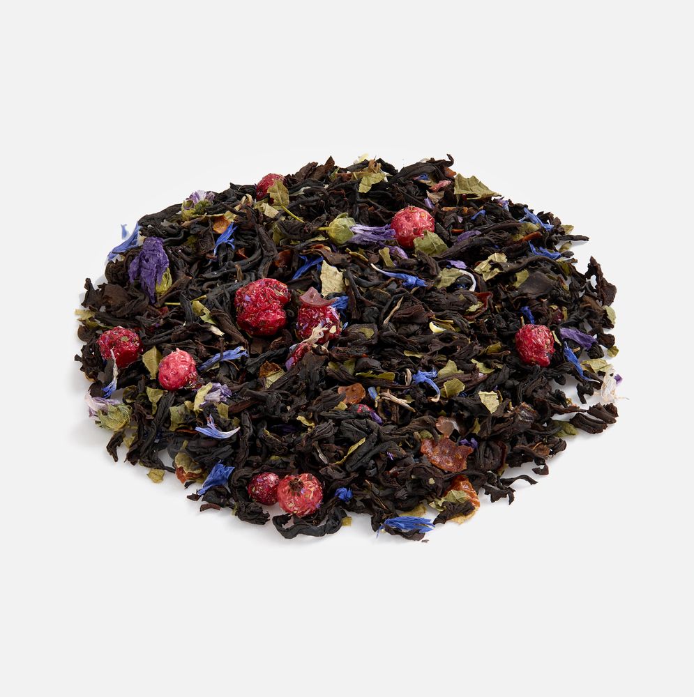 Состав: чай черный индийский листовой OPА Assam , ягоды красной смородины сублимированные, листья смородины, лепестки василька, цветы мальвы, кусочки шиповника, ароматизатор «черная смородина»