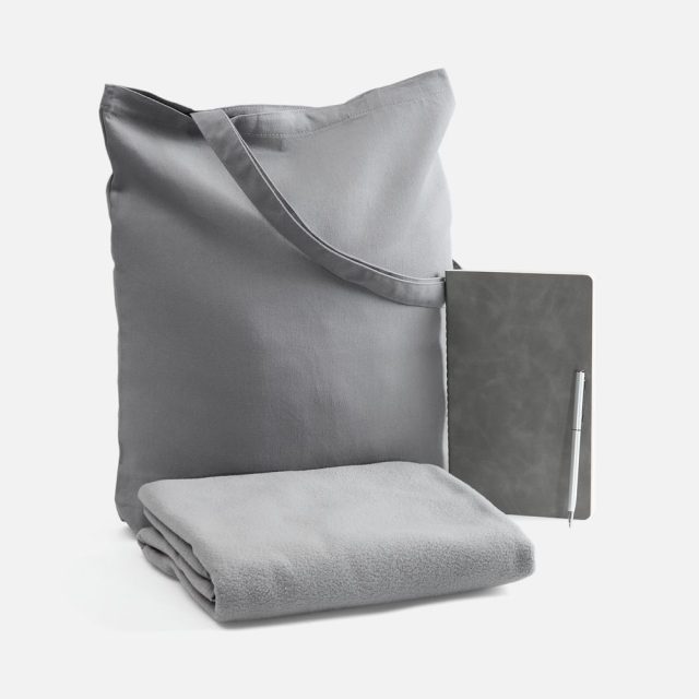 Набор с основной канцелярией и пледом — классика жанра в уютном исполнении. С компактным блокнотом под рукой будет удобно делать заметки в любое время, а легкий флисовый плед позволит выразить самые теплые пожелания.