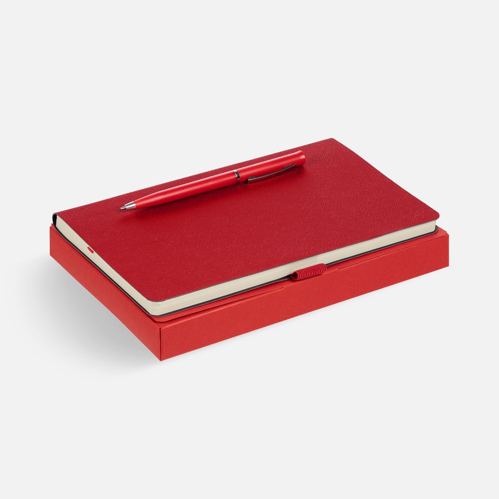 Зауженный ежедневник и ручка комплементарного оттенка в простой лаконичной коробке — готовое предложение делового подарка для сотрудников и партнеров.