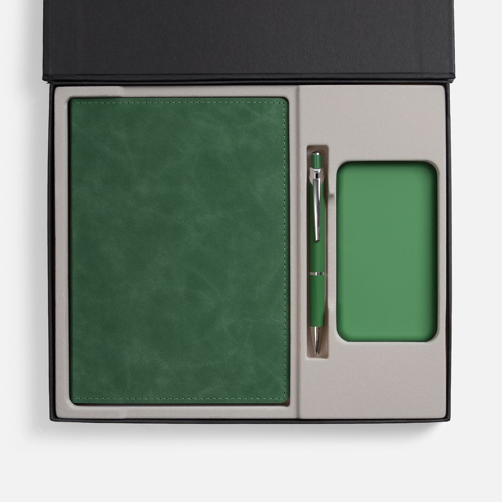 Набор с внешним аккумулятором позволит всегда оставаться на связи, а бессменная офисная классика — ежедневник и ручка — помогут направить энергию в правильное русло!
