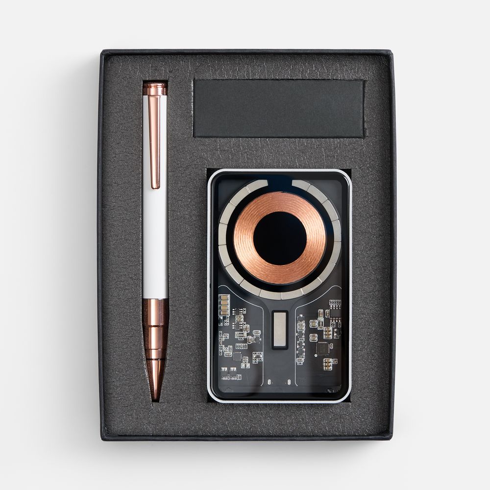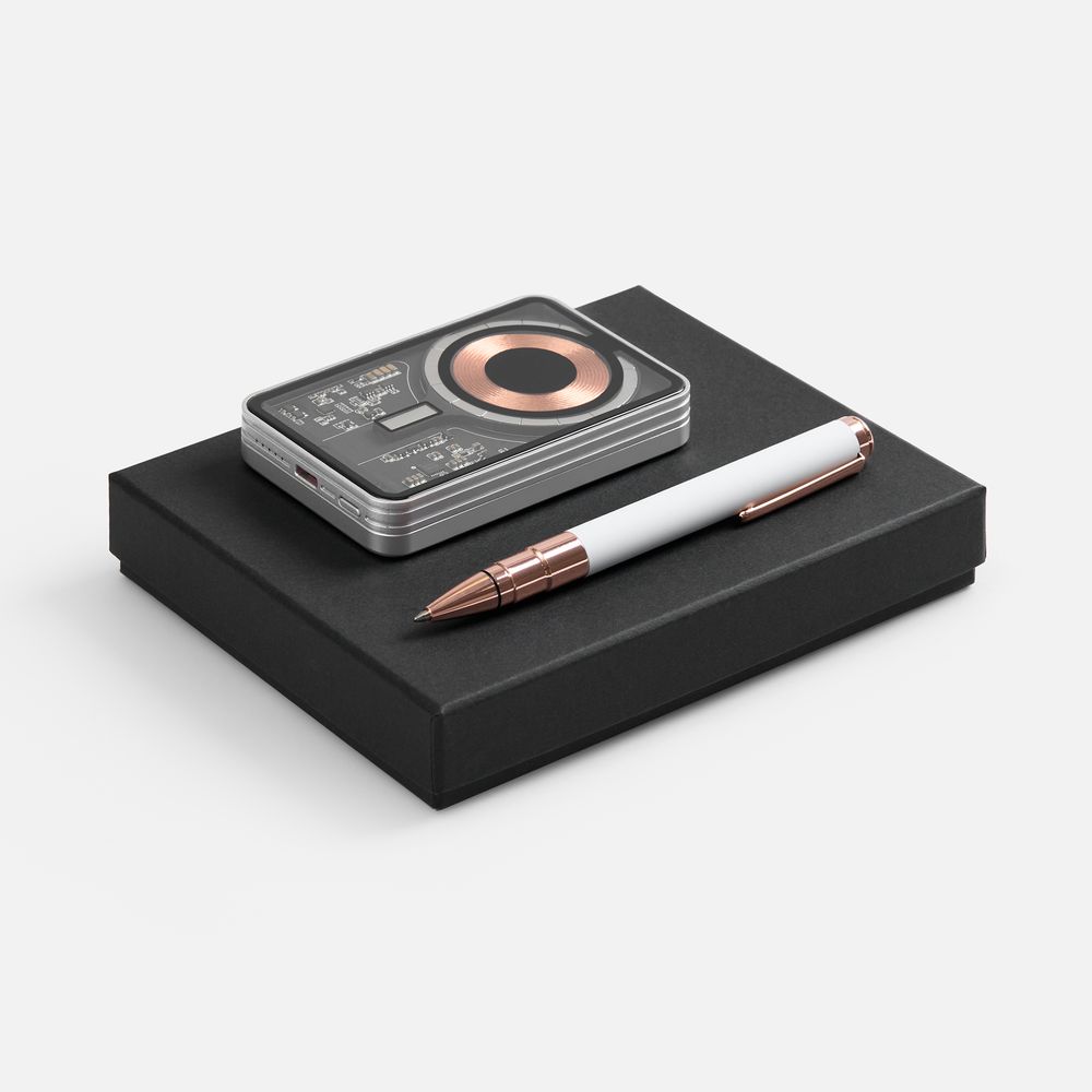Необычный беспроводной аккумулятор Cooper Ergo и увесистая ручка Kugel Rosegold составляют вместе идеальный дуэт — с легким оттенком стильного стимпанка и намеком на прогрессивность. Набор станет идеальным подарком как для коллег, так и для руководителей, и покорит получателей оригинальностью и новизной исполнения.