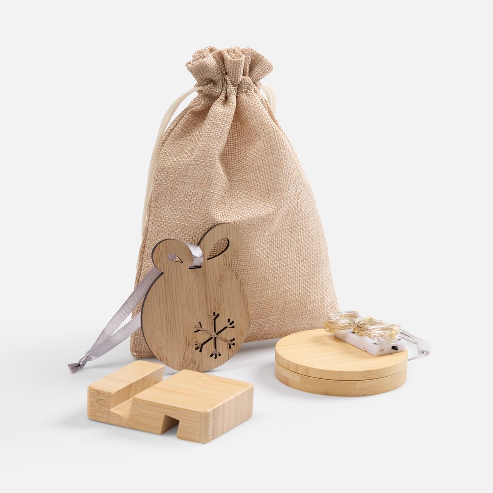 Woodward — миниатюрный подарочный набор, изящно сочетающий в себе экологичность с технологичностью. В небольшом холщовом мешочке уместились полезные аксессуары для основных гаджетов, а также, конечно, нашлось место и для приятных новогодних атрибутов. Большинство изделий изготовлено из дерева, что добавляет набору привлекательности.
