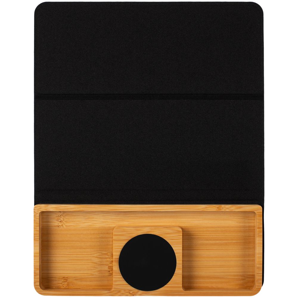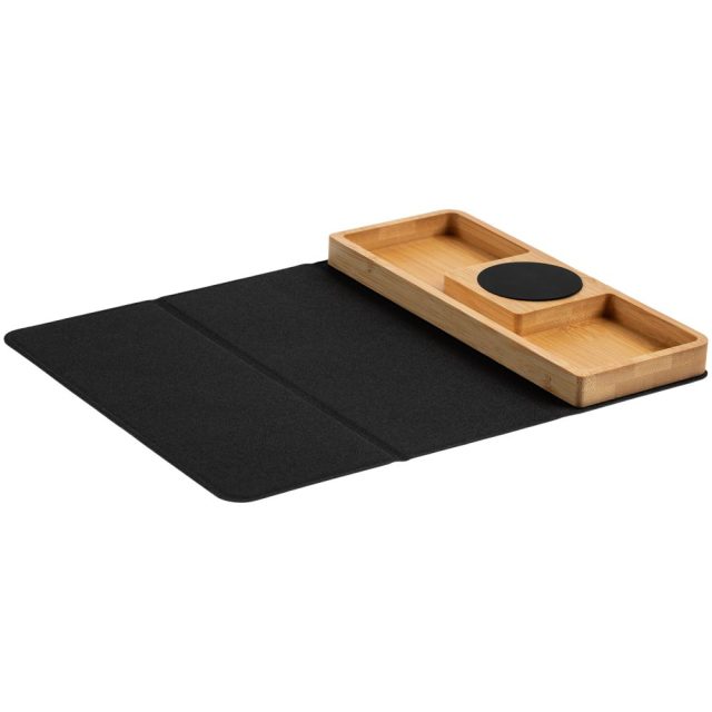 Настольный органайзер Midstream — это бамбуковая подставка для беспроводной зарядки телефона с емкостью для хранения мелких предметов и коврик для мыши. Зарядка и коврик с помощью магнитов образуют единое целое, но при необходимости могут использоваться и по отдельности. Коврик складывается: легко подобрать удобный размер.