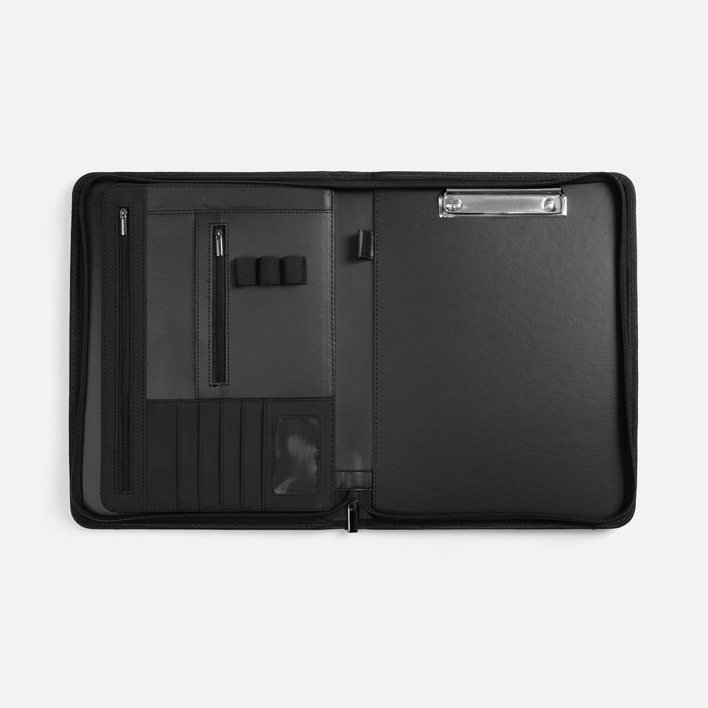 Во вместительной папке предусмотрено множество отделений для визиток, бумаг и письменных принадлежностей — для идеальной организации пространства. Особое преимущество — встроенный блокнот с листами в линейку, который можно легко открепить и положить на его место свои записи, например, для презентаций.