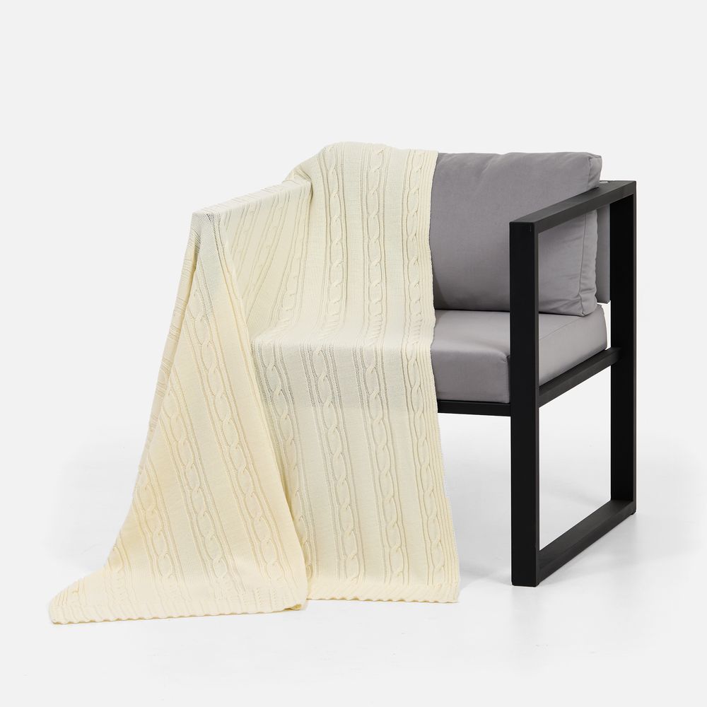 Тонкое переплетение вертикальных кос-жгутов создает благородный стиль, где простота линий встречается с изысканной рельефной текстурой. Плед из мягкого акрила сохраняет тепло, оставаясь удивительно легким и воздушным.