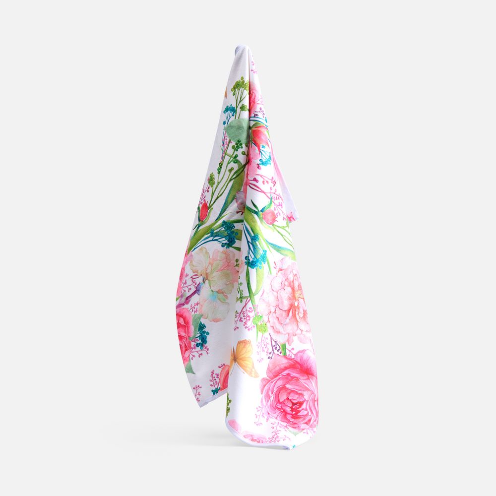 Лицевая сторона полотенца похожа на велюр. Синтетическое полотно и короткостриженые петельки позволяют нанести полноцветное изображение методом сублимационной печати. Оборотная сторона выполнена из натурального хлопка и выглядит как обычное махровое полотенце. Она хорошо впитывает воду и приятна к телу. Края полотенца обработаны подгибкой.