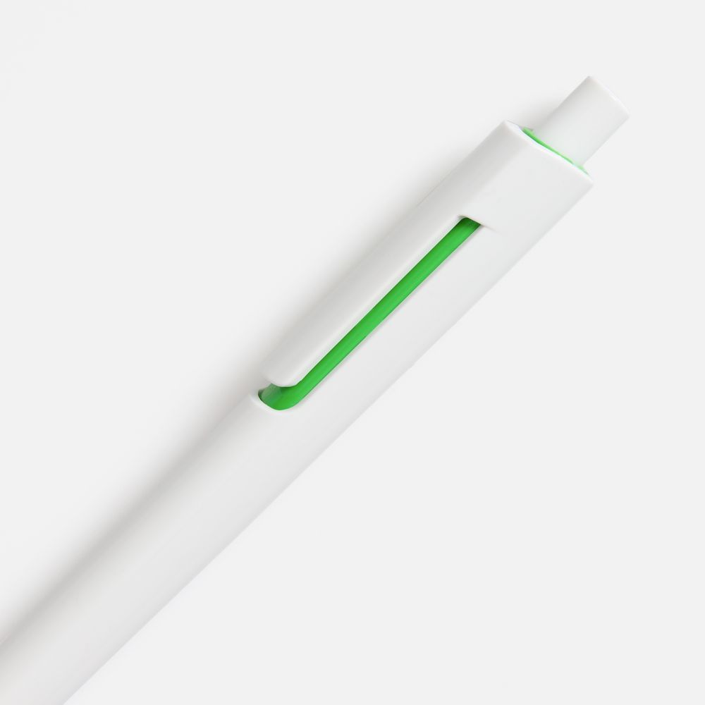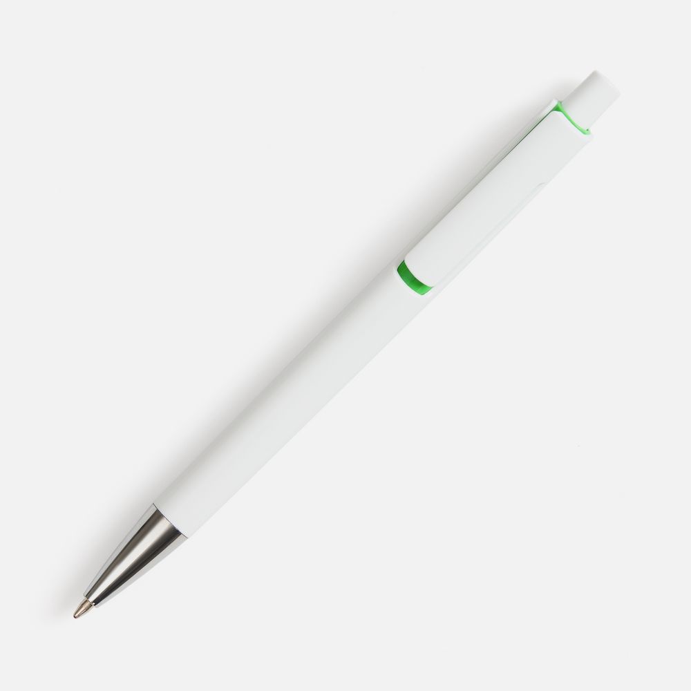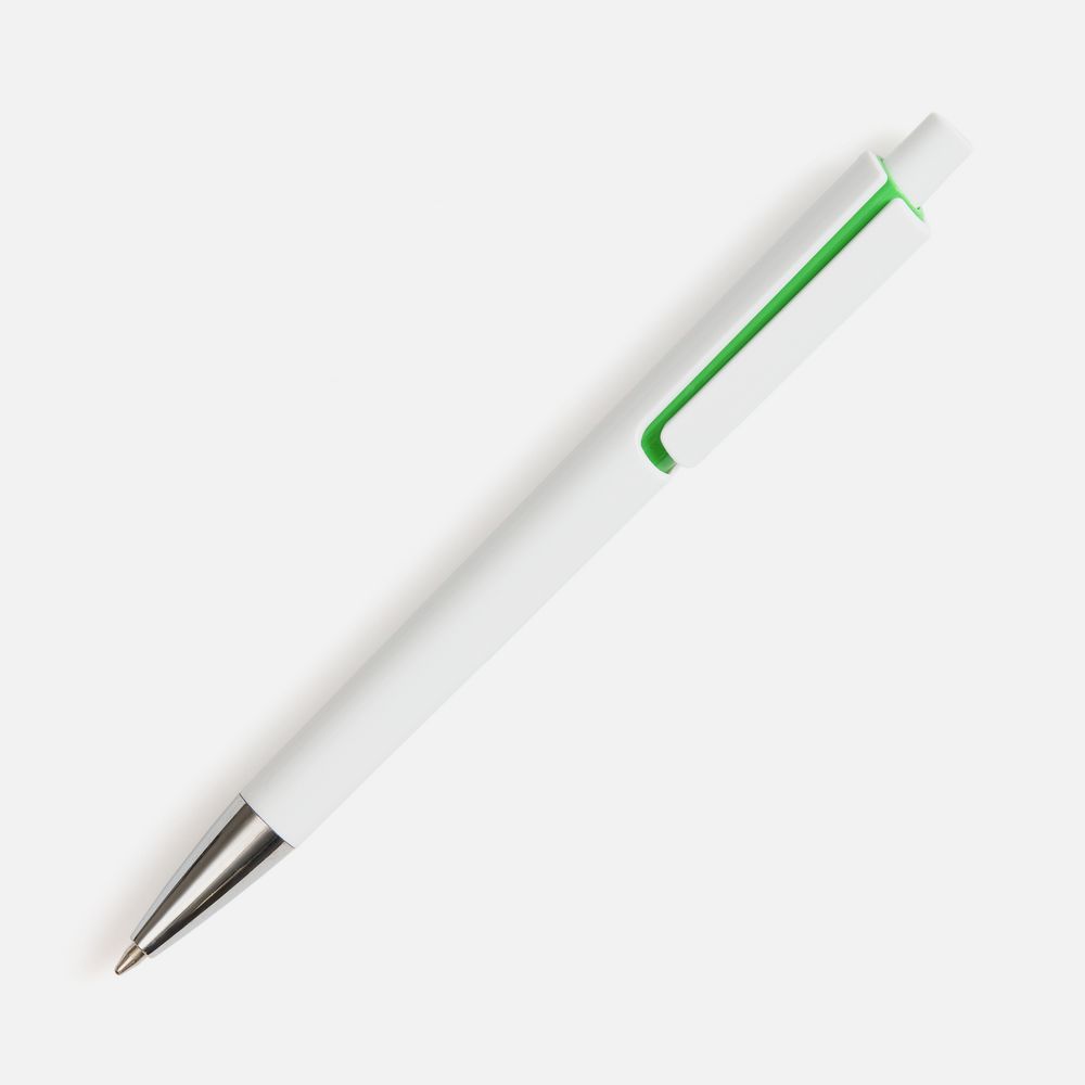 Шариковая ручка с глянцевым белым корпусом и цветовым акцентом у клипа, который дополнит логотип компании.