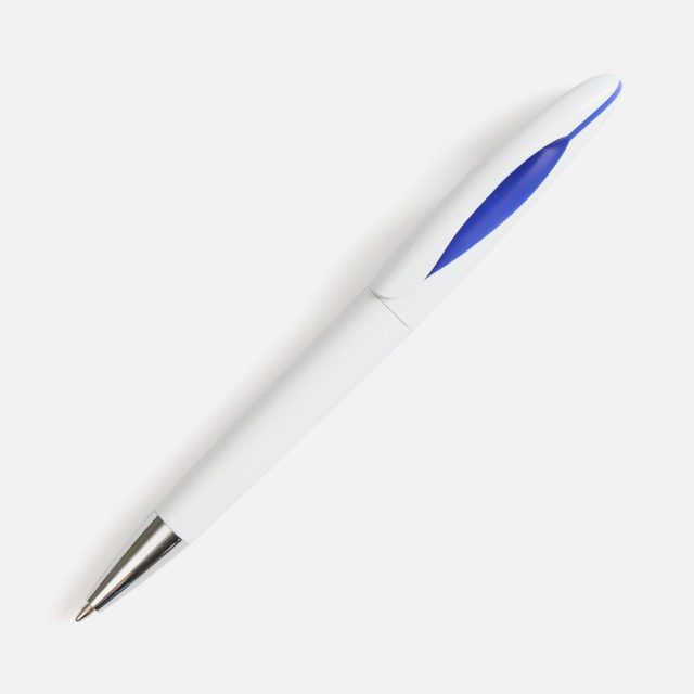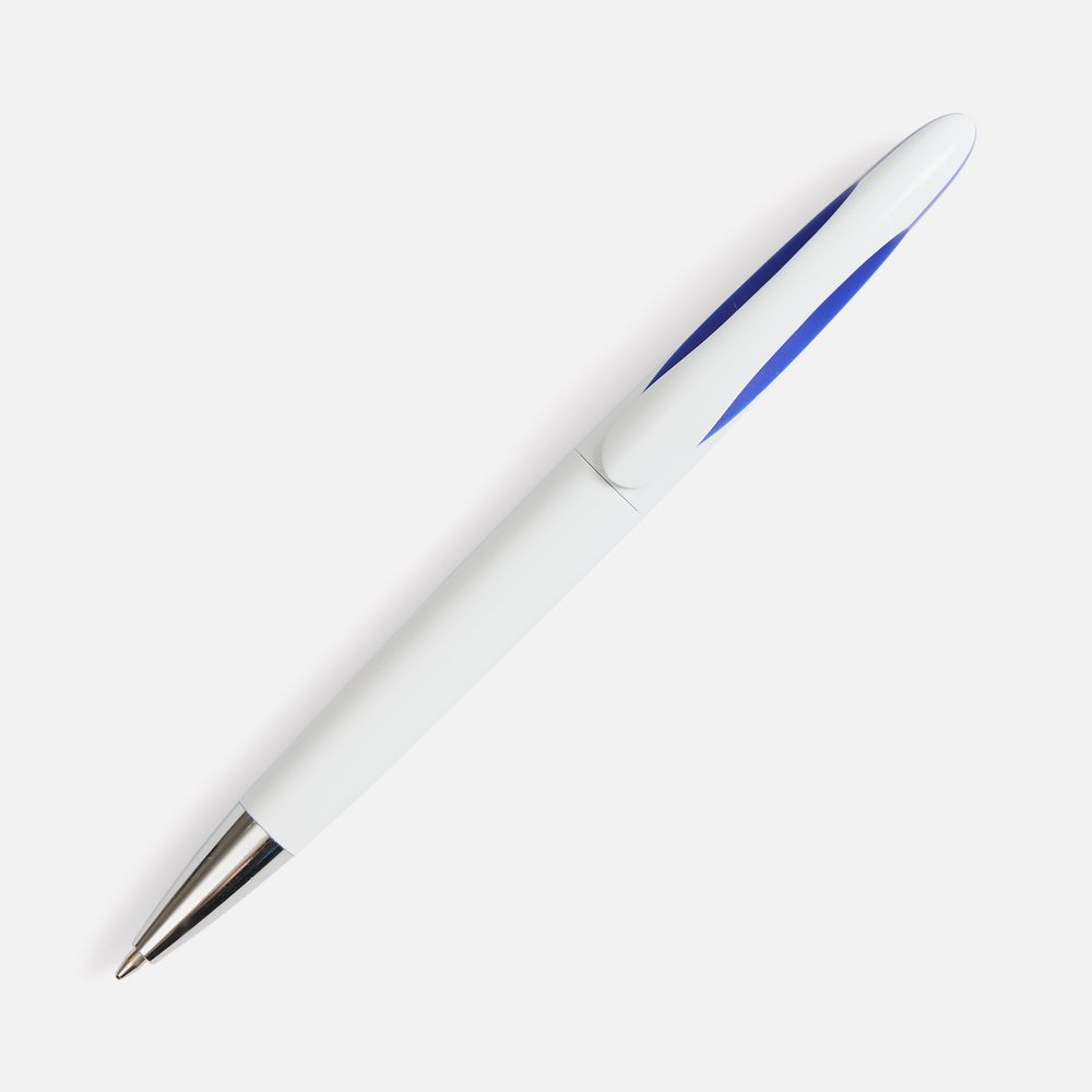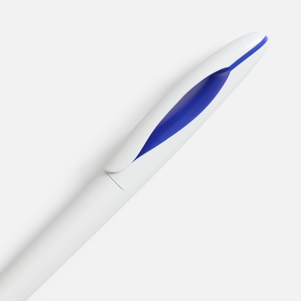 Шариковая ручка приятных округлых форм с белым глянцевым корпусом и цветовым акцентом.