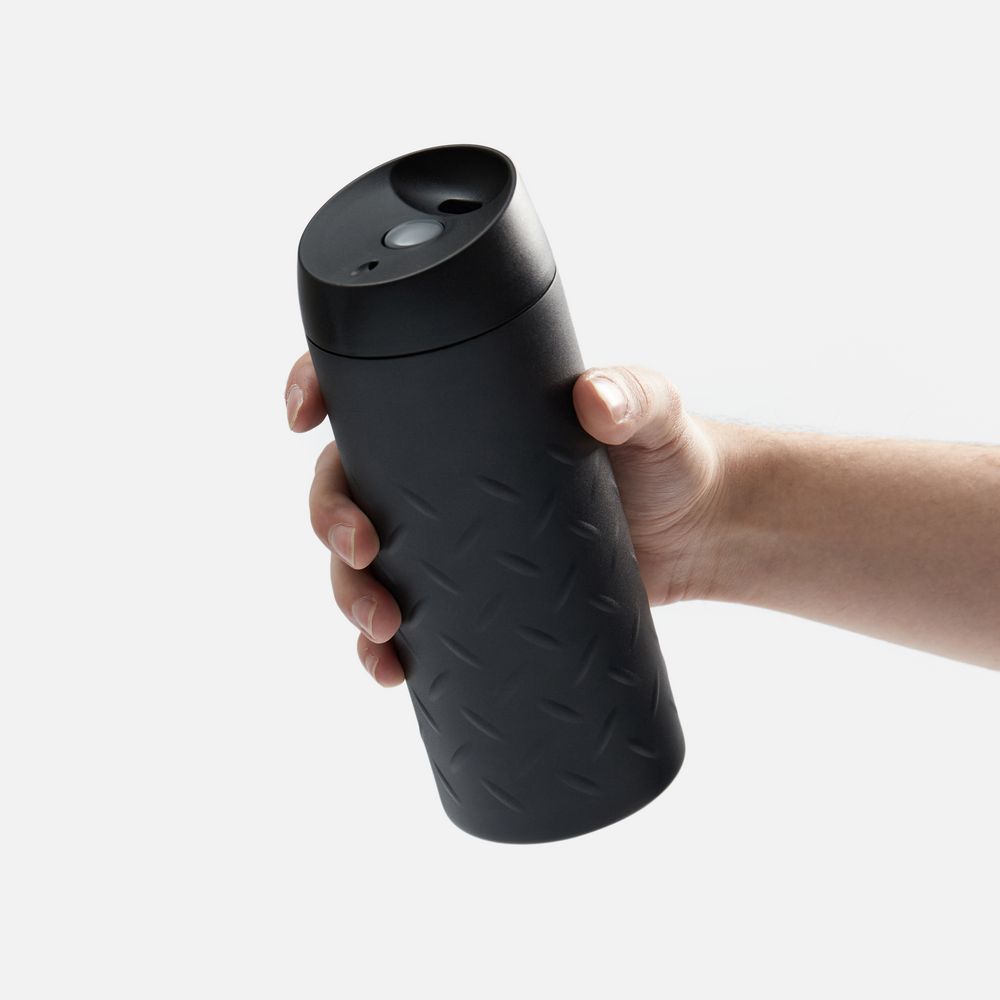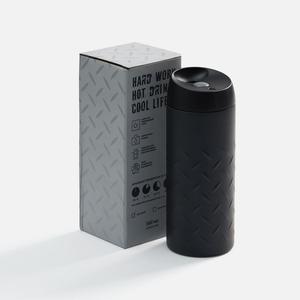Двухслойная вакуумная конструкция из нержавеющей стали. Герметичная завинчивающаяся крышка с нажимным клапаном для питья. Стакан подходит для большинства автомобильных подстаканников.