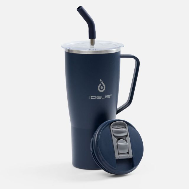- 2 крышки в комплекте: одна на 100% герметичная с механизмом блокировки отверстия для питья, вторая — с отверстием для трубочки
